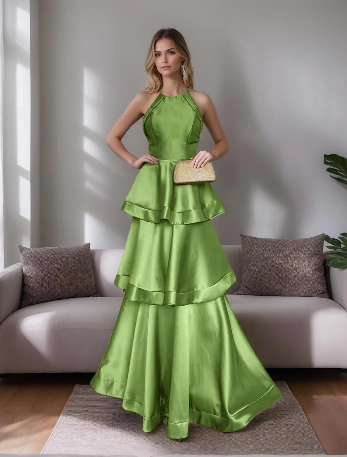 A-Line Evening Gown Elegant Tiered Dress Formal Wedding Floor Length Sleeveless Halter Neck Satin - Lime Green / US 2 / UK 8 / EU 32