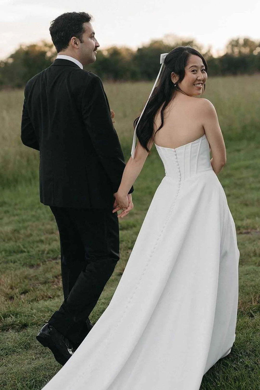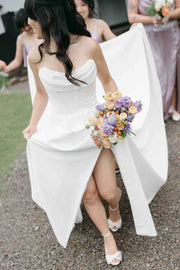 A-Line Strapless Pleated Satin Long Beach Wedding Dress