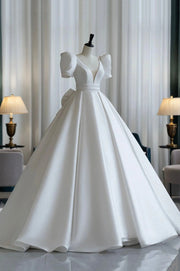 A-Line V-Neck Satin Wedding Dress White Short Sleeve Bridal Gown with Bow - US 2 / UK 8 / EU 32