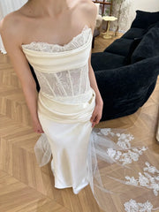 Elegant Satin Lace Mermaid Wedding Dress with Strapless Draped Neckline Sheer Embroidered Corset Detachable - US 2 / UK 8 / EU 32