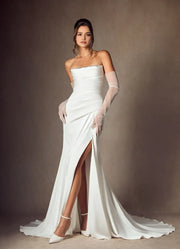Elegant Strapless Mermaid Satin Satin Wedding Dress Ruched Bodice High Slit Train for Glamorous Weddings - US 2 / UK 8 / EU 32