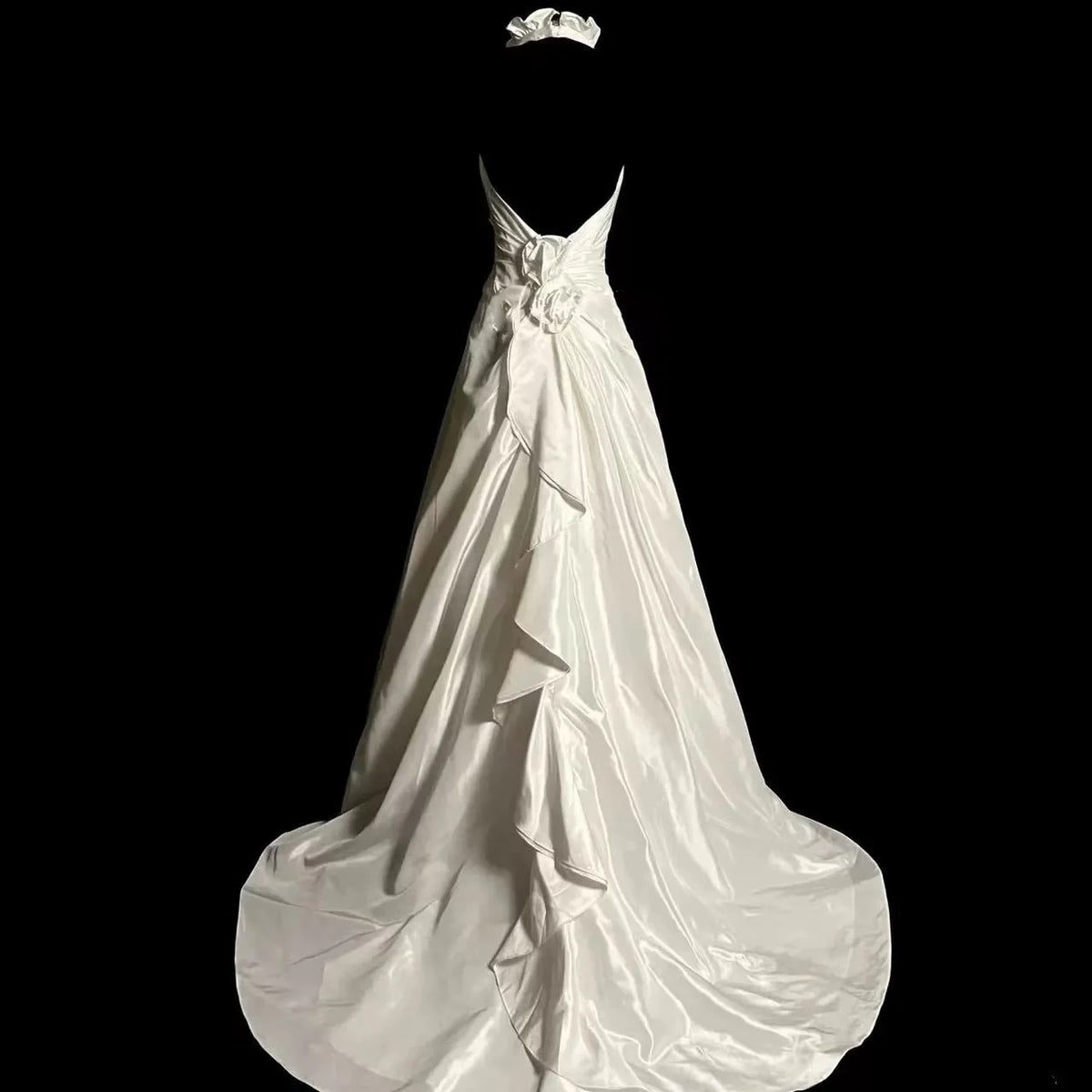 Romantic A-Line Halter-Neck Sleeveless Ruffled White Satin Wedding Dresses - US 2 / UK 6 / EU 32