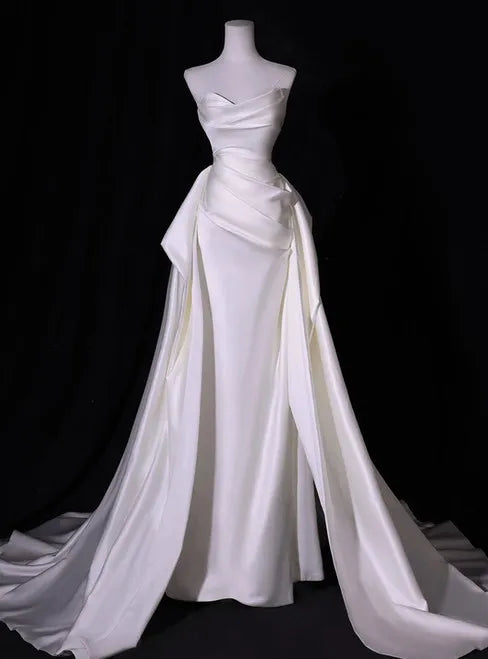 Simple White Mermaid Satin Strapless Pleats Wedding Dress