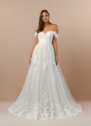 Timeless Off Shoulder Tulle A-Line Off the Wedding Dresses Clean Lace Lines Subtle Volume Floor Length Train Premium Pick for Classic Brides - US 2 / UK 8 / EU 32