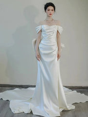 Unique Mermaid Off The Shoulder Pleats Short Sleeves Satin Fitted Tight for Women Wedding Dresses