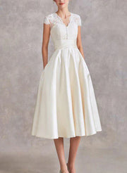V-Neck Short Sleeves Tea-Length Satin Wedding Dresses Lace
