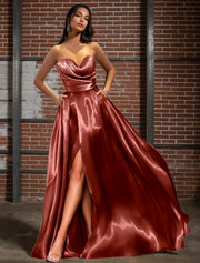 A-Line Evening Gown Celebrity Style Dress Carnival Wedding Reception Floor Length Sleeveless Sweetheart Satin with Ruched Pocket