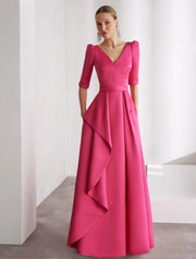 A-Line Evening Gown Elegant Dress Beach Wedding Formal Floor Length Half Sleeve V Neck Pink Dress Satin with Ruffles - US 2 / UK 8 / EU 32