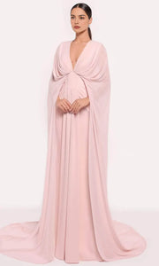 This blush pink evening gown is crafted for red - carpet - worthy moments. It showcases a plunging V - neck that adds allure, paired with draped cape sleeves for a dramatic and elegant silhouette. The twist - front detail at the bodice creates a unique focal point, enhancing the flowing skirt. Made from soft, lightweight fabric, it drapes beautifully and ensures a regal presence. Perfect for high - end galas or exclusive events, this dress combines exquisite details like the cape sleeves, twist front, and blush hue to help you make an unforgettable entrance.