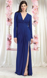 Burgundy Long - Sleeve Evening Dress with Plunging V - Neckline Draped Bodice and High Thigh Slit for Glamorous Occasions - Royalblue / US 2 / UK 8 / EU 32