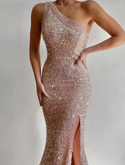 Mermaid Trumpet Quinceanera Dresses Elegant Dress Wedding Wedding Guest Floor Length Sleeveless One Shoulder Polyester Backless with Sequin Slit - Khaki / US 2 / UK 8 / EU 32