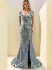 Elegant long slit sequin off shoulder sleeveless pleated hem floor length evening dress