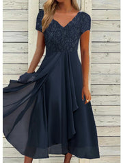 Women's Wedding Guest Cocktail Dress Elegant Midi Dress V-Neck Lace Short Sleeve Chiffon Flowy Navy Blue Evening Party Summer