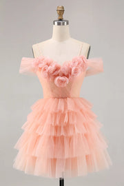 Blush Cold Shoulder Tulle A Line Short Homecoming Dress with Ruffles