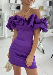 Column Off-the-Shoulder Sleeveless Satin Short/Mini Homecoming Dress With Ruffles  - US 2 / UK 8 / EU 32