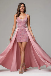 Detachable Train Pink Spaghetti Straps Sequins Homecoming Dress