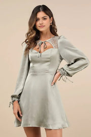 Elegant Green Satin Homecoming Dress with Lace Cut Out Neckline, Lantern Sleeves Bow Detail: Perfect for Memorable School Dances - US 2 / UK 8 / EU 32