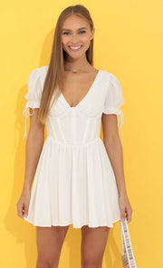 This elegant white chiffon homecoming dress is a perfect blend of romance and sophistication. The deep V - neckline creates a bold and alluring silhouette, while the puff sleeves with tie - up details add a touch of femininity and playfulness. The corset bodice not only flatters your figure but also gives the dress a structured and polished look. The flared skirt flows gracefully, allowing for easy movement and a feminine appearance. Whether you're posing for photos or dancing the night away at a school dance, this dress combines the charm of a deep V - neckline, the sweetness of puff sleeves, the sophistication of a corset bodice, and the grace of a flared skirt to ensure you stand out with confidence and style.
