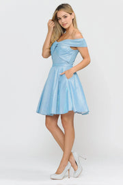 Glamorous Light Blue Off - Shoulder Homecoming Dress with Bow Detail Sparkle Fabric Flared Skirt with