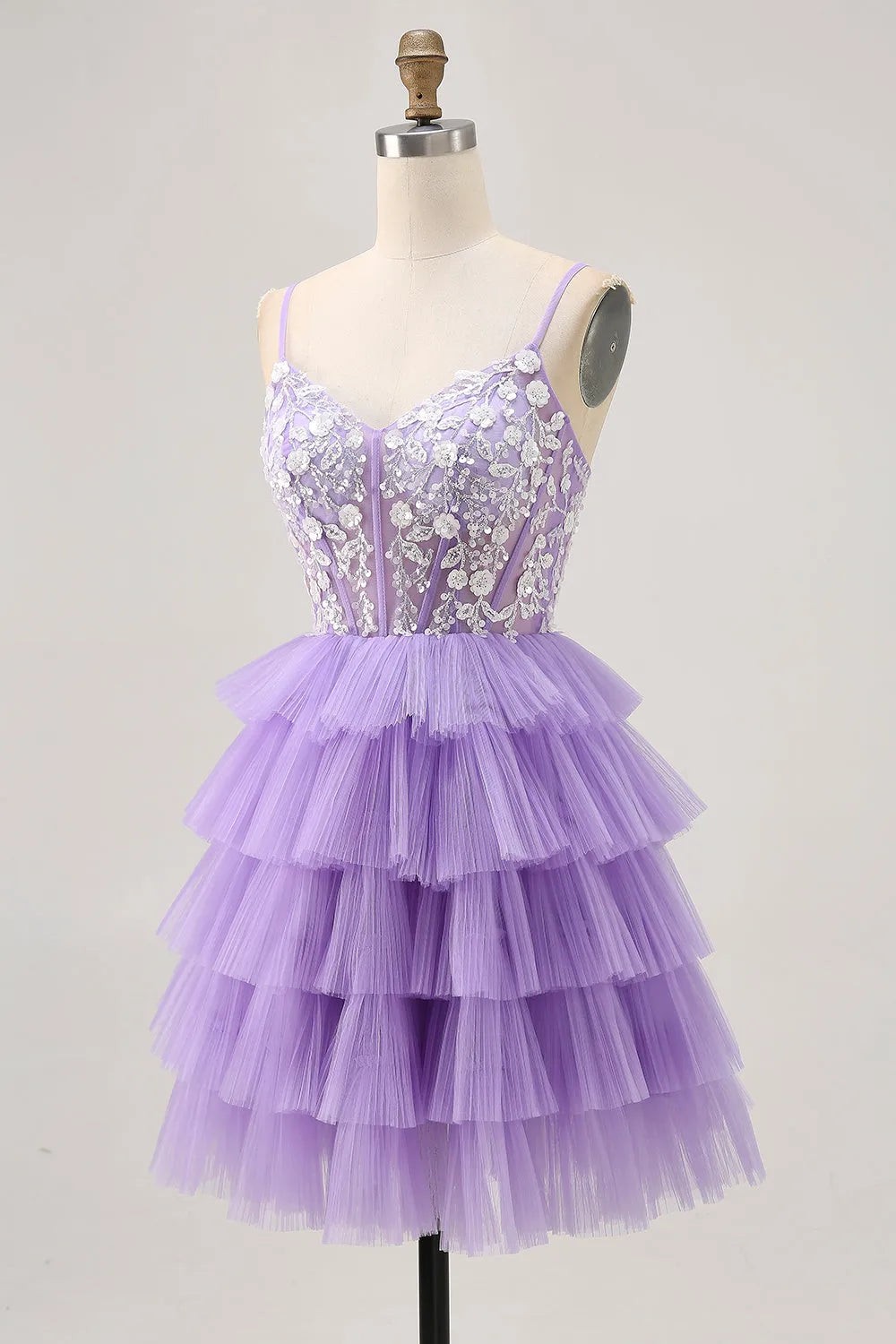 Lavender Floral Corset Short Homecoming Dress with Ruffles - US 2 / UK 8 / EU 32