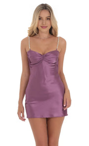 Lavender Satin Homecoming Dress Pearl Embellished Straps Ruched Bust Bodycon Fit Perfect for Sophisticated School Dances Memorable Reunion Nights - US 2 / UK 8 / EU 32