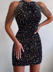 Sexy sequined hip hugging elegant crystal fringe solid color party back to school dress