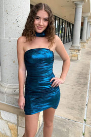Royal Blue Metallic Strapless Tight Short Homecoming Dress