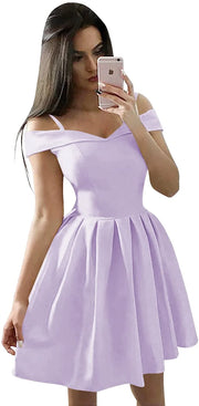 Simple Lilac Satin Spaghetti Strap Off the Shoulder Short Homecoming Dress
