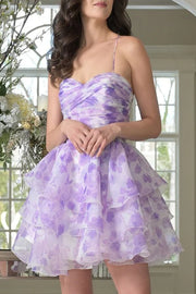 Spaghetti Straps A-Line Sweetheart Print Layered Short Homecoming Dress - Purple / US 2 / UK 8 / EU 32