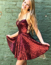 Spaghetti Straps Sparkly Burgundy A Line Homecoming Dress