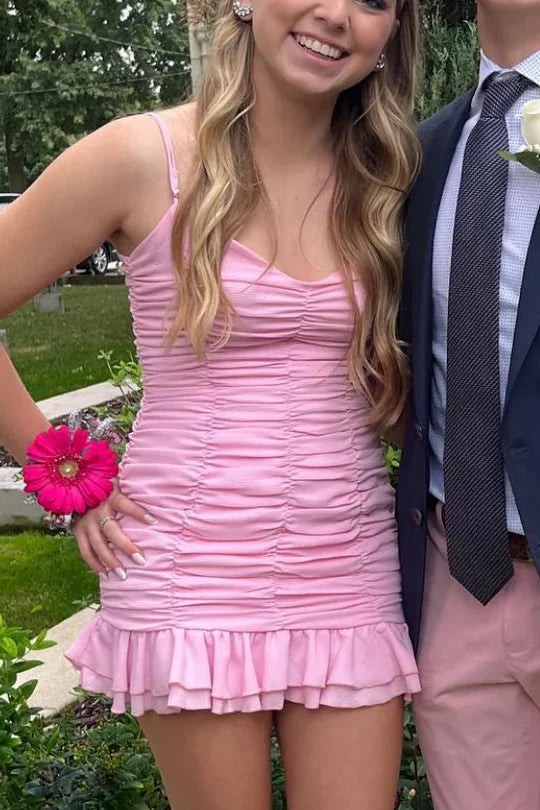 Spaghetti Straps V-Neck Ruffles Ruched Sleeveless Homecoming Dress - Pink / US 2 / UK 8 / EU 32
