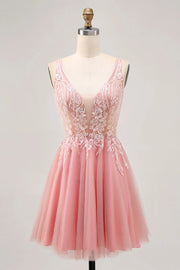 Sparkly Blush V-Neck Beaded Short Tulle Homecoming Dress