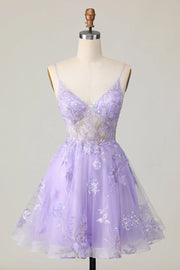 Sparkly Purple A Line Short Floral Homecoming Dress with Lace