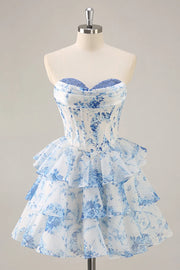 White and Blue Floral Sweetheart Corset Short Homecoming Dress with Ruffles