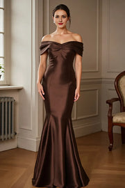 Brown Satin Off the Shoulder Long Mermaid Mother of the Bride Dress