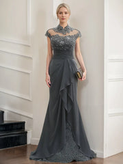 Charming Mermaid High-Neck Cap Sleeves Sequin Cutout-Back Floor-Length Mother of the Bride Dresses with Ruffles Rhinestones