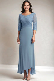 Chiffon Round Neck Lace Dusty Blue Mother of The Bride Dress with Half Sleeves - US 2 / UK 8 / EU 32