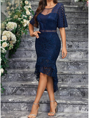 Dress Mother of the Bride Dress Elegant Party Simple Crew Neck Asymmetrical Spandex Short Sleeve with Lace - Navy Blue / US 2 / UK 8 / EU 32