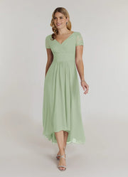 Step into elegance with this A-line Mother of the Bride Dress. It features a V-neckline, cap sleeves with lace detailing, and a lace-back design. The high-low length adds a stylish touch, making it perfect for weddings and other formal occasions.