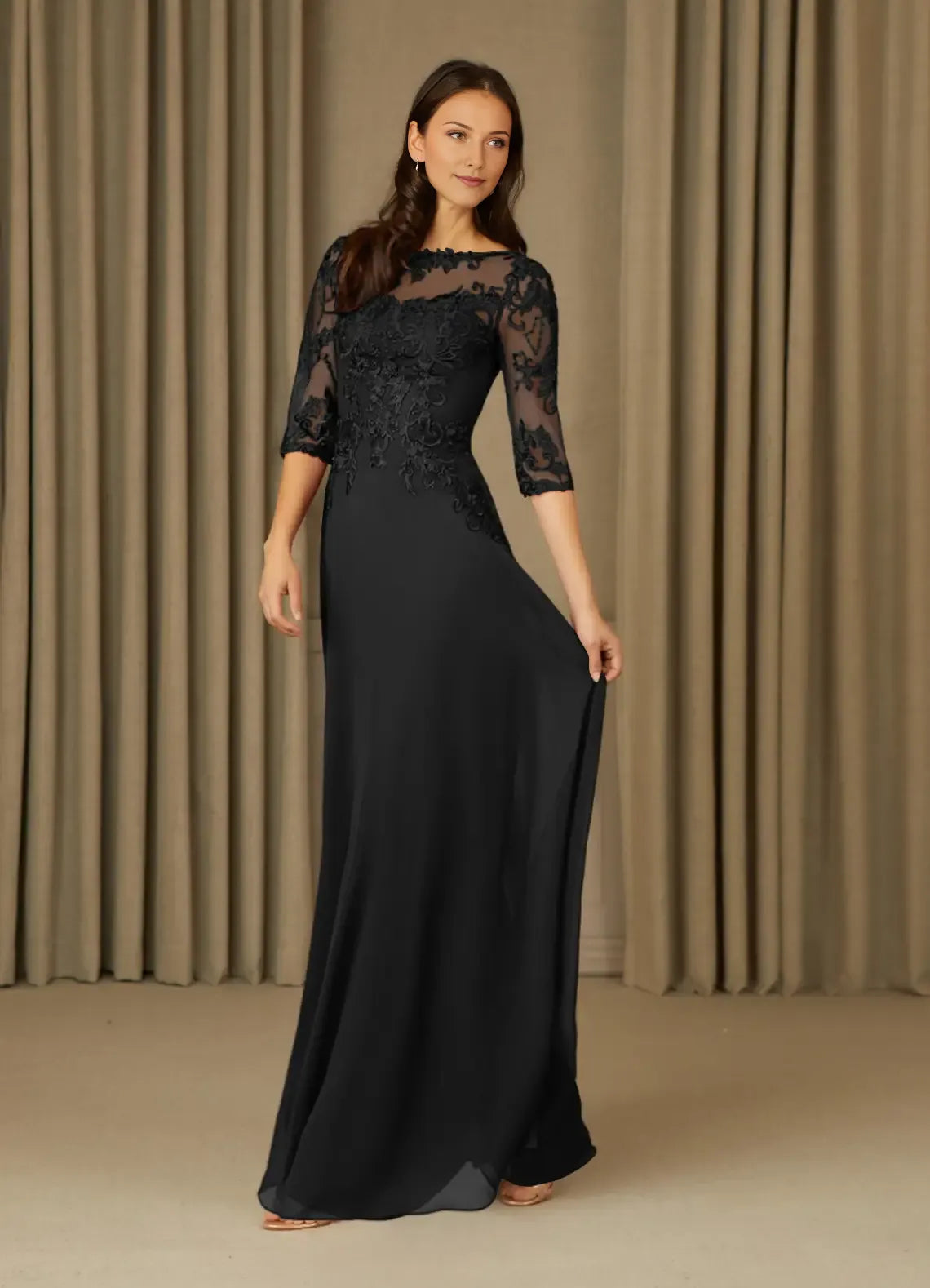 Elegant Black A-Line Lace Chiffon Mother of the Bride Dress with Illusion Mesh Neckline Embroidered Appliqués 3/4 Sleeves and Flowy Maxi Skirt