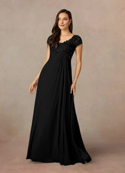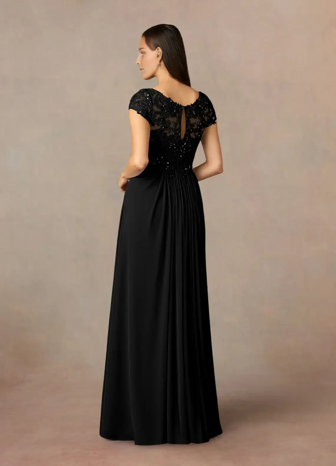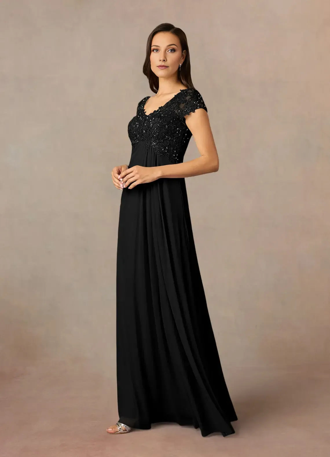 Elegant Black A-Line V-Neck Sequin Lace Mother of the Bride Dress with Cap Sleeves Beaded Bodice and Flowy Chiffon Skir - US 2 / UK 8 / EU 32