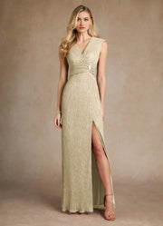 Elegant Champagne Gold A-Line Pleated Mother of the Bride Dress Plunging V - Neck Sleeveless Fabric Waist Accent Side - Slit - US 2 / UK 8 / EU 32