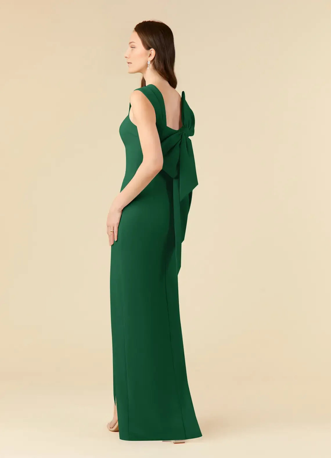 This a fashionable, floor-length crepe column gown. Her current, asymmetrical straps are adorned with an origami style bow at the back. There is a side slit to ensure total freedom of movement on the dance floor.