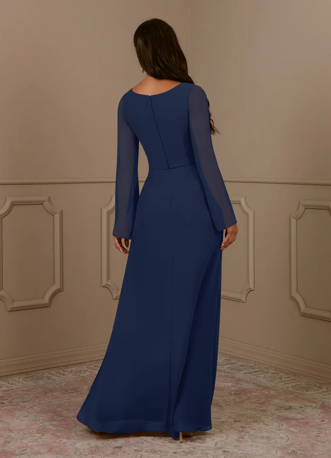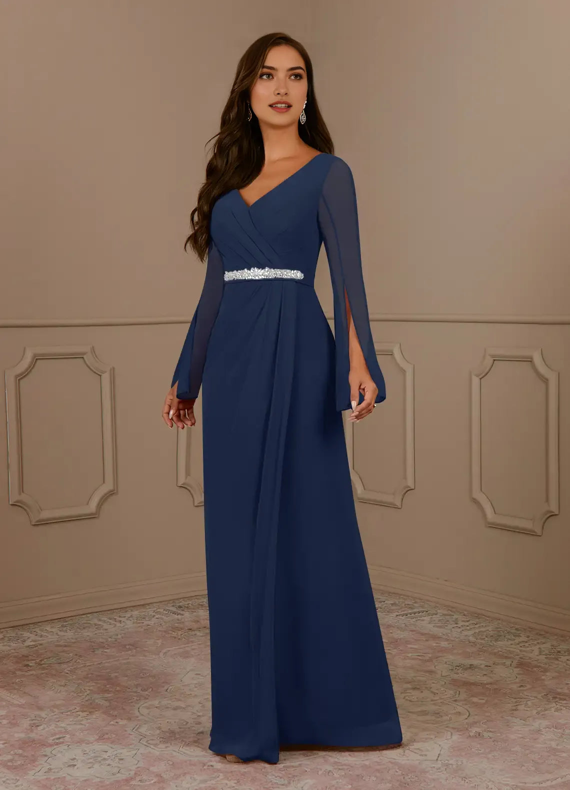 Elegant Dark Navy A-Line V-Neck Pleated Chiffon Mother of the Bride Dress V - Neck Sheer Chiffon Bell Sleeves Rhinestone Embellished Waistband Flowy Floor Length Skirt