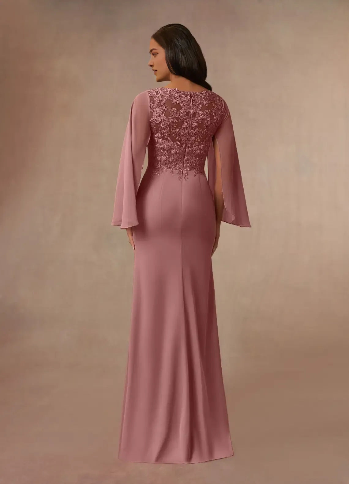 Elegant Desert Rose Mermaid V-Neck Lace Chiffon Mother of the Bride Dress Sheer Bell Sleeves Lace Embroidered Bodice Asymmetric Ruffled Skirt - US 2 / UK 8 / EU 32