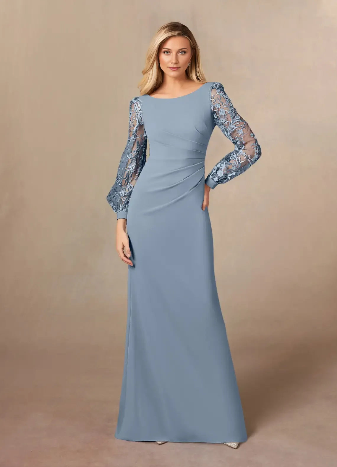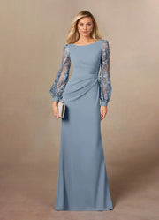 Elegant Dusty Blue Mother of the Bride Dress with Boat Neckline Lace Embroidered Lantern Sleeves Ruched Bodice and Mermaid Silhouette