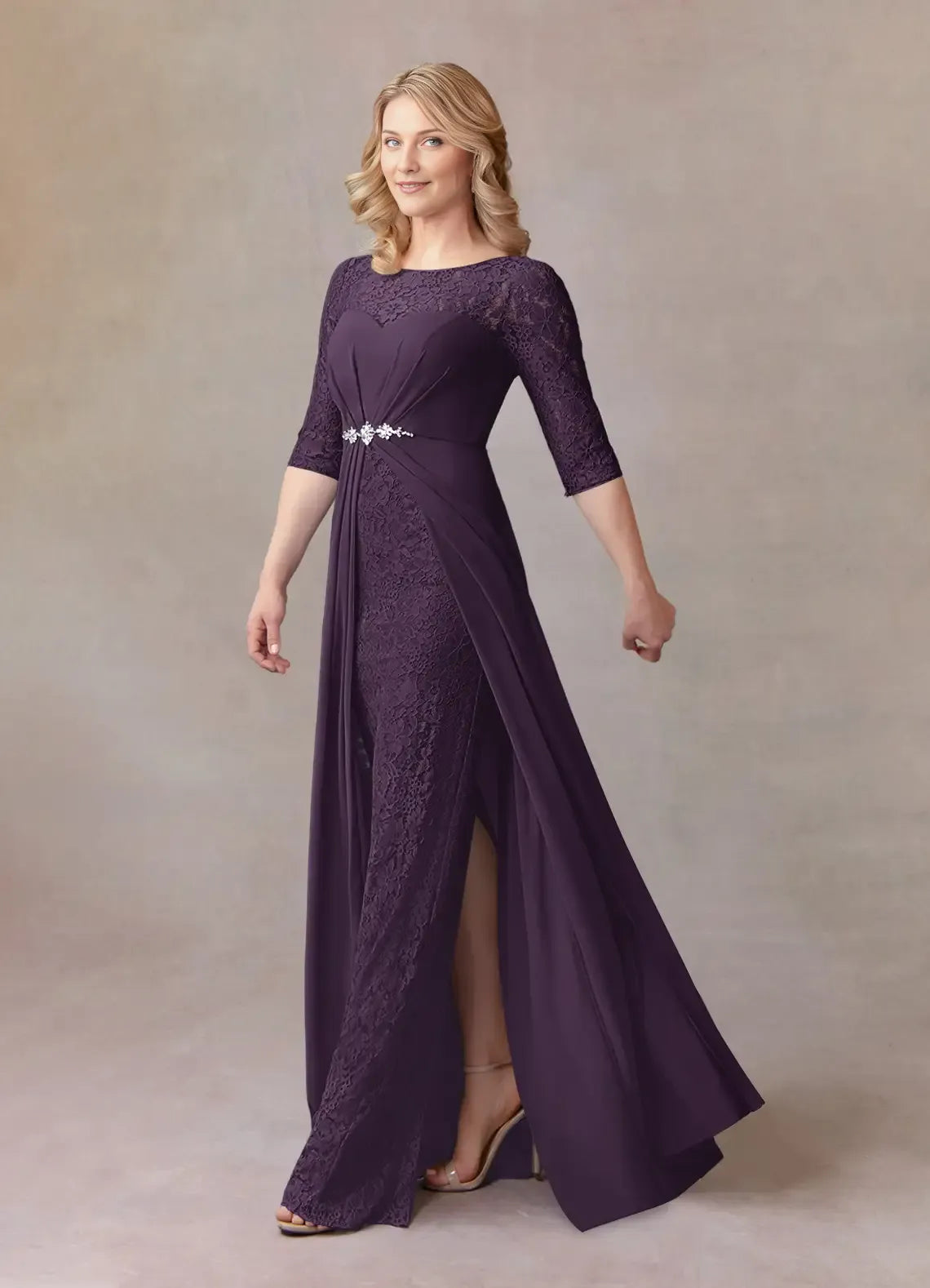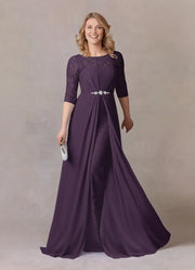 Elegant Plum A-Line Scoop lace Chiffon Mother of the Bride Dress with Lace Overlay Boat Neckline 3/4 Sleeves