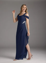 Square-Neck Off-The-Shoulder Mother of the Bride Dress. Occasions: Prom, black tie events, formal weddings, and upscale parties.