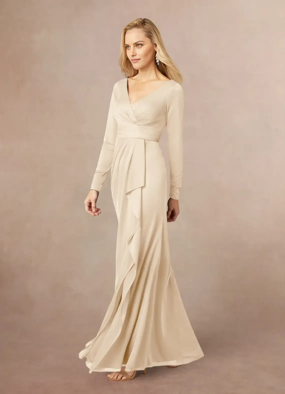 Elegant Sheath V-Neck Long-Sleeve Back Zip Floor-Length Mermaid Side Leg Slit Mother of the Bride Dress - US 2 / UK 8 / EU 32