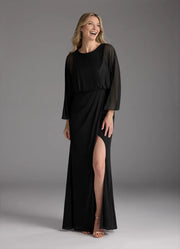 Formal Black Mother of the Bride Dresses with Sheer Sleeves Ruched High Waist Side Slit and Flowy Maxi Silhouette - US 2 / UK 8 / EU 32